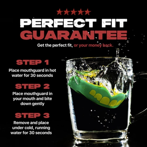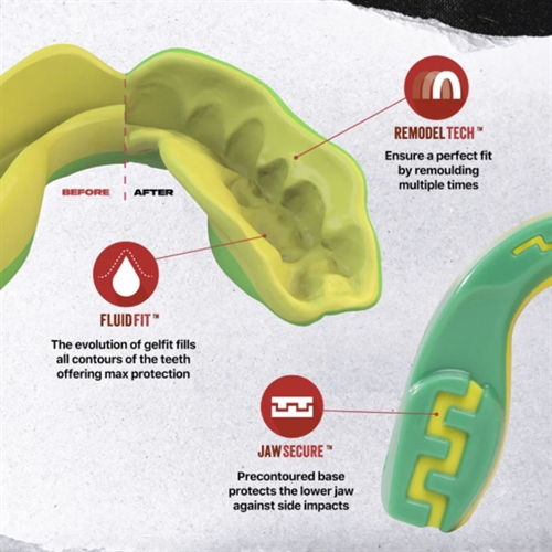 Fluid Fit™ sørger for en tett og komfortabel passform, der tannbeskytteren "klikker" på plass og sitter trygt – uten å forstyrre pust, tale eller muligheten til å drikke. Jaw Secure™ gir ekstra beskyttelse til underkjeven og tennene gjennom en forhåndsformet base og støtdempende puter.